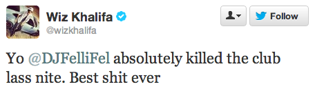 DJcity was present during the shoot which began in Felli’s studio and ended at a packed club in Hollywood with a live performance featuring Ne-Yo, Tyga, and Wiz Khalifa. We haven’t watched the final video yet but we’re excited to see how it turns out considering what we witnessed. Wiz had this to say the next day: